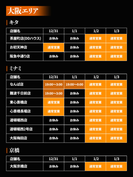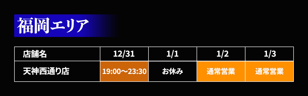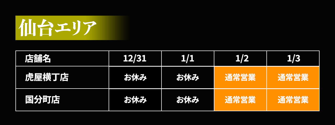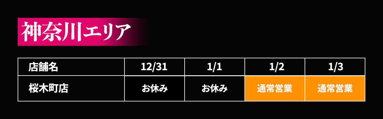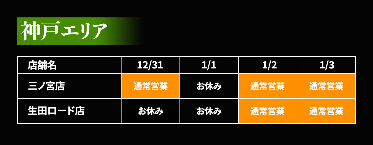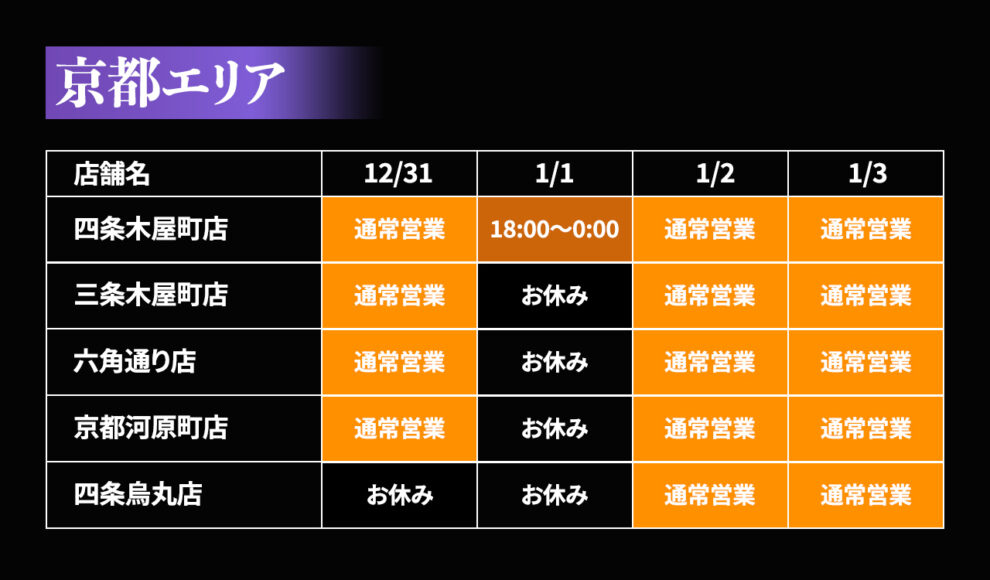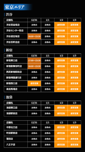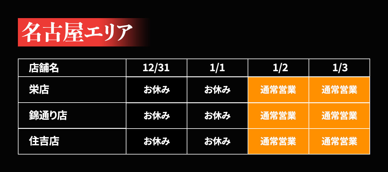 年末年始(12/31〜1/3)の各店の営業日を、下記の表のとおりご案内致します。